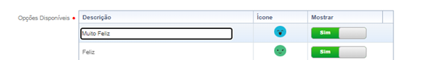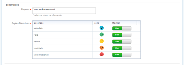 Com a opção Mostrar, habilite ou desabilite a exibição dos sentimentos, sendo no mínimo 2 sentimentos a serem habilitados. Também será possível editar a Descrição do sentimento (50 caracteres no máximo).