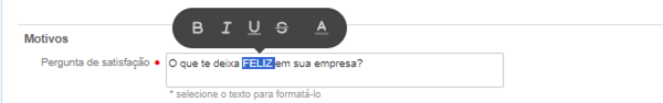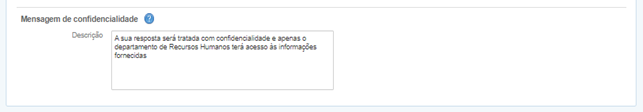 Essa seção define a mensagem que será apresentada no rodapé da tela de pesquisa e tem como objetivo informar ao respondente, que as informações de sua resposta serão vistas apenas pelos Recursos Humanos da empresa, já que a ferramenta tem como usuário alvo os profissionais de RH.