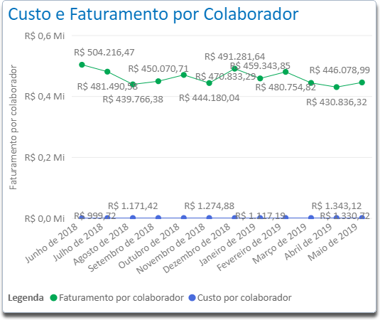 Através desse gráfico é possível realizar avaliações dos valores médios obtidos de Faturamentos por colaborador sobre o seu Custo em cada mês.