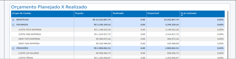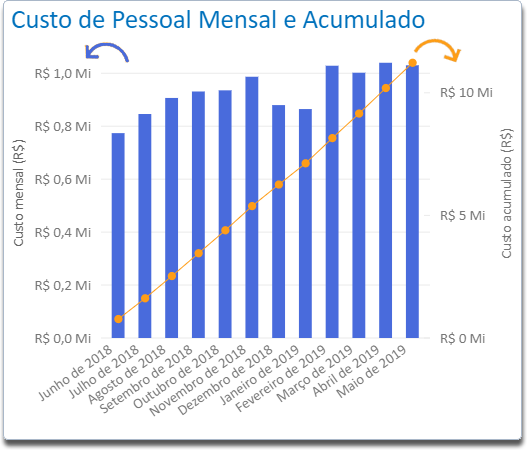 Por meio desse indicador é possível acompanhar os Custos mensais de pessoal e o total acumulado até o momento.