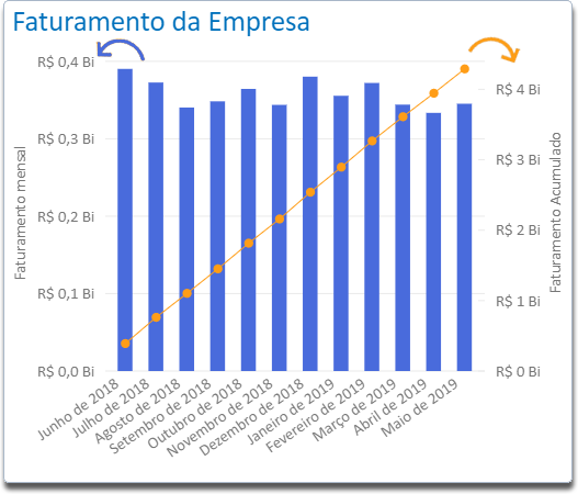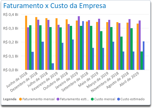 Através deste indicador é possível acompanhar o Faturamento mensal e acumulado da empresa e compará-lo com a estimativa de Faturamento estabelecida para o período.