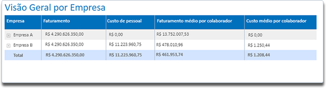Através do indicador Visão Geral por Empresa é possível observar os valores do Faturamento, Custo de pessoal, Faturamento médio por colaborador e Custo médio por colaborador de cada Empresa cadastrada.