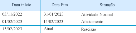 Porém, antes de finalizar seu afastamento ele solicitou no dia 15/02/2023 o encerramento do contrato. Ao cadastrar a rescisão do colaborador o sistema atualizou os históricos dos contratos conforme a vigência das ocorrências.