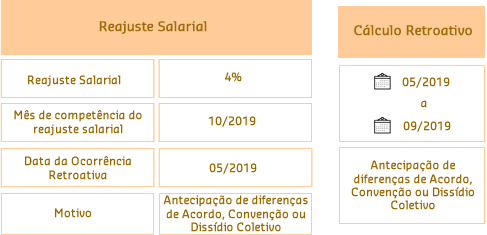 Por não estabelecer o acordo entre o Sindicato, a empresa decidiu por iniciativa própria fazer um reajuste no mês de outubro de 2019 de 4%, retroativo à data base, para compensar a ausência do Dissídio referente a esse período.
