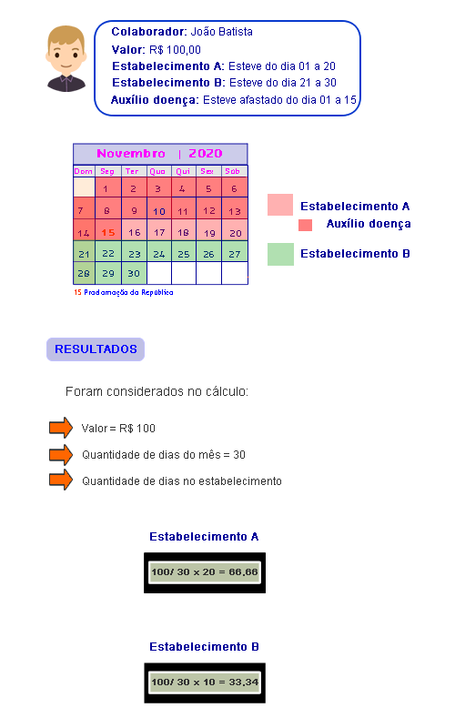 Não serão consideradas escalas no cálculo proporcional, apenas o período em que o colaborador esteve alocado em cada lotação tributária, considerando os dias do mês.