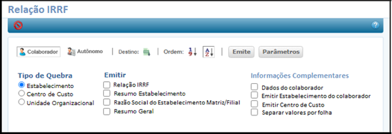 As opções Dados do colaborador, Emitir Estabelecimento do colaborador, Emitir Centro de Custo e Separar valores por folha, só poderão ser habilitadas quando a opção de emissão Relação IRRF estiver marcada.