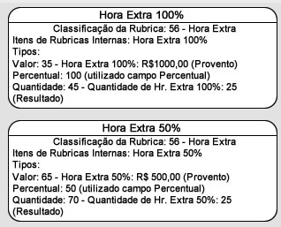 Supondo que o funcionário José da Silva em sua rescisão contratual tenha que receber 25 horas extras de 100% e 25 horas extras de 50%. Neste caso é necessário que seja feito um cadastro de itens de rubricas internas para cada percentual de horas extras.