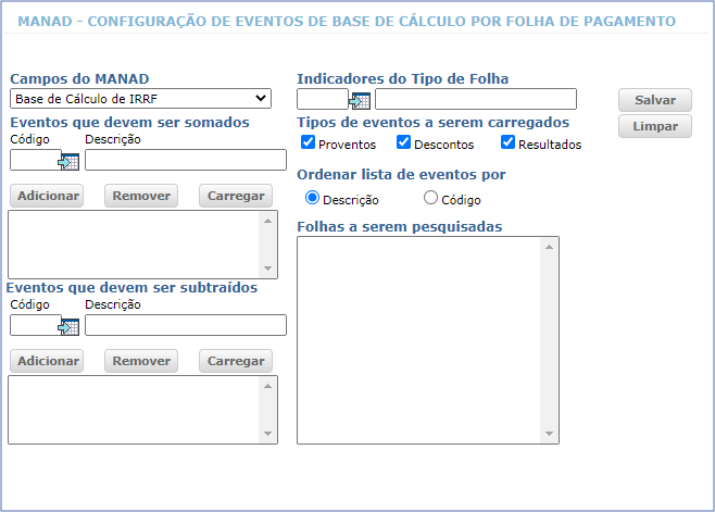Através desta função configure os eventos que irão compor os valores de base de cálculo que serão