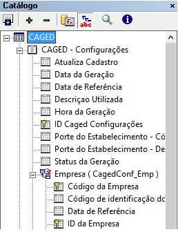 Existem duas variantes dessa janela, uma é a janela de Catálogo apresentada na tela principal do Gen.te Relata - Designer, que pode ser exibida pela barra de ferramentas ou pelo menu Exibir, item Catálogo, e a outra é a janela apresentada como passo para vários comandos em que é necessário indicar algum campo do banco de dados, como por exemplo na inserção de uma Seção de grupo feita pelo menu Inserir, item Seção.