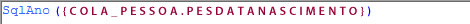 A fórmula acima utiliza o campo do banco de dados COLA_PESSOA.PESDATANASCIMENTO que contém a data de nascimento do colaborador. Utilizando a macro SqlAno junto ao campo COLA_PESSOA.PESDATANASCIMENTO fará com que seja retornado somente o ano da data de nascimento do colaborador.
