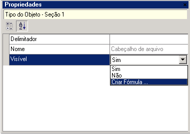 Para adicionar uma das propriedades, clique sobre Criar Fórmula na Propriedade Visível da seção do Cabeçalho de Arquivo/ Rodapé de Arquivo .