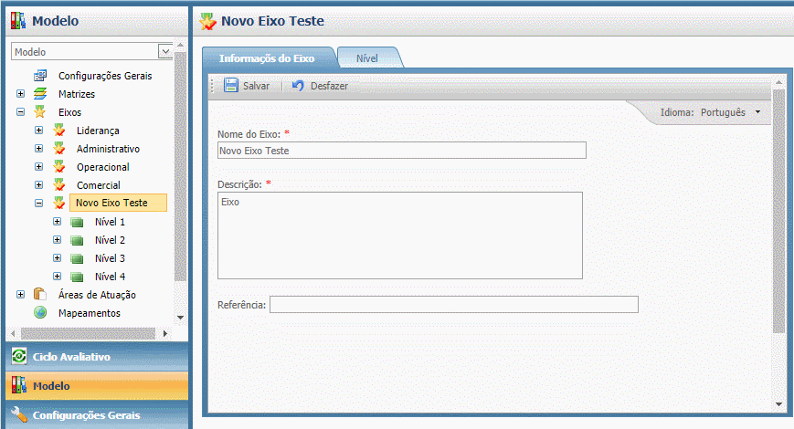 Para cadastrar um novo item, clique sobre o botão e insira o Nome do Eixo e uma Descrição que o identifique. Defina o Número de Níveis que o eixo terá.