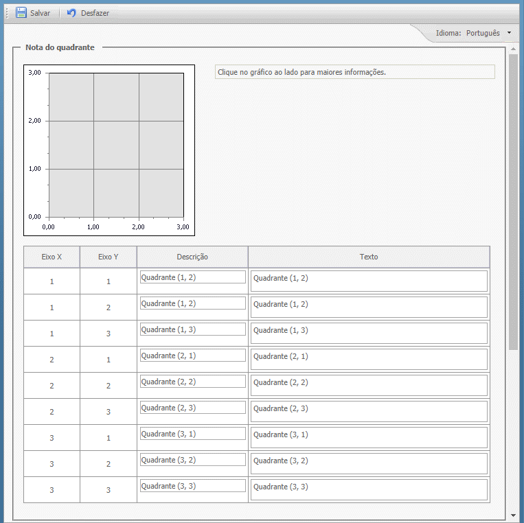 Através dessa guia é possível definir o intervalo de valores que cada quadrante irá receber no gráfico. Para isso basta informar os valores desejados nos respectivos campos desejados dos Eixos X, Y e Z. As descrições dos Eixos X, Y e Z também podem ser alteradas conforme desejado. Para isso basta alterar a descrição nos respectivos campos.