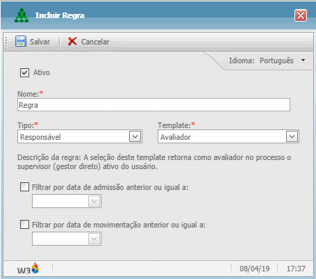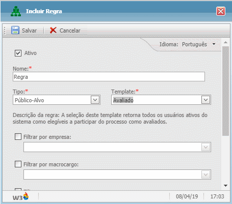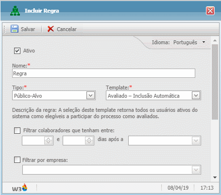 Para os templates Avaliado e Avaliado – Inclusão Automática é possível realizar a seleção de colaboradores Ativos, Inativos e/ou ambos.