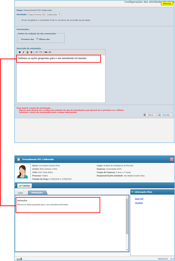 Na seção Orientações, defina a ordem de exibição da guia Orientações no portal do colaborador, selecionando uma das seguintes opções: Primeira aba ou Ultima aba.