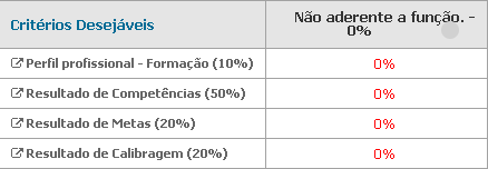 Nos critérios desejáveis são exibidos os níveis de aderência (baixíssimo, baixo, etc), com o percentual de aderência aos critérios desejáveis da posição e o nível dessa aderência, conforme imagem: