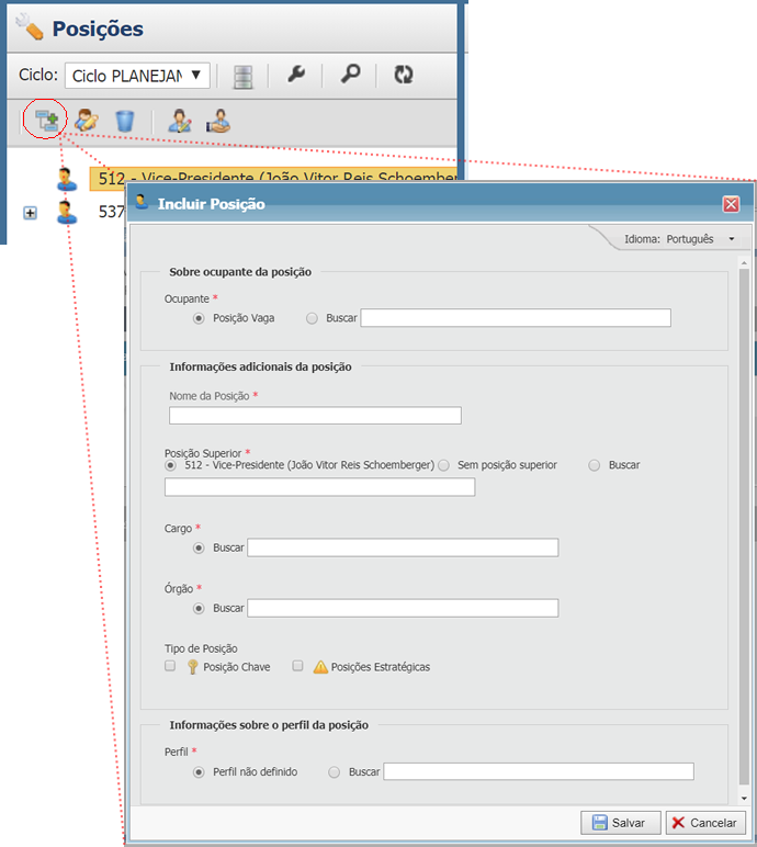 Posições, é um conceito que permite avaliar riscos presentes na posição e também considerar e avaliar ocupantes/sucessores para estas posições. Através desta funcionalidade é possível incluir posições, assim como, editar e excluir posições já existentes.