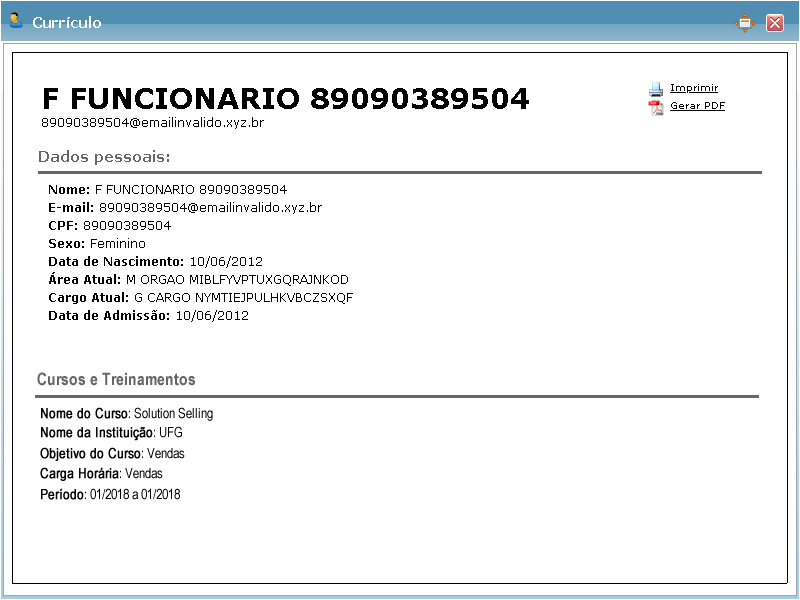 Visualizar Currículo - Ao clicar nessa opção, o sistema exibirá a tela de visualização do currículo conforme imagem abaixo: