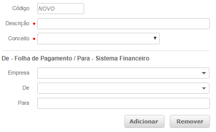 Não é possível cadastrar uma Configuração de/para sem que tenha sido informado um Conceito e sem que, pelo menos, um item tenha sido adicionado à Lista de De/Para.