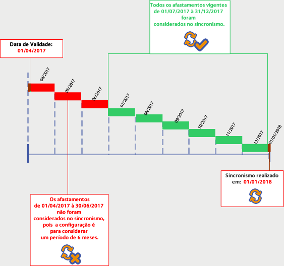 Sendo assim, o sistema verificou os afastamentos vigentes a partir de 01/07/2017 e os considerou no sincronismo. Os demais afastamentos não foram considerados, pois mesmo que a Data de validade seja 01/04/2017 a opção Considerar afastamentos vigentes estava parametrizada para considerar apenas 6 meses.