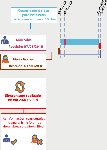 Dessa forma, o sistema realizou a busca dos afastamentos começando pelo dia 05/01/2018 até o dia 20/01/2018 (15 dias), como a rescisão do colaborador João da Silva foi no dia 07/01/2018 o afastamento foi considerado no sincronismo e o afastamento da Maria Gomes desconsiderado, pois é anterior ao dia 05/01/2018.