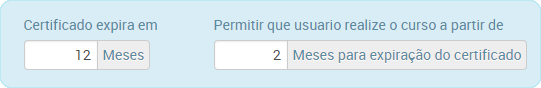 Seguindo esta parametrização, o usuário realizou o curso em 01/2018 e seu certificado irá expirar em 01/2019. Para que ele não aguarde o certificado vencer para realizar a renovação, o curso estará disponível novamente para esse usuário em 11/2018, ou seja, 2 meses antes da expiração do certificado.