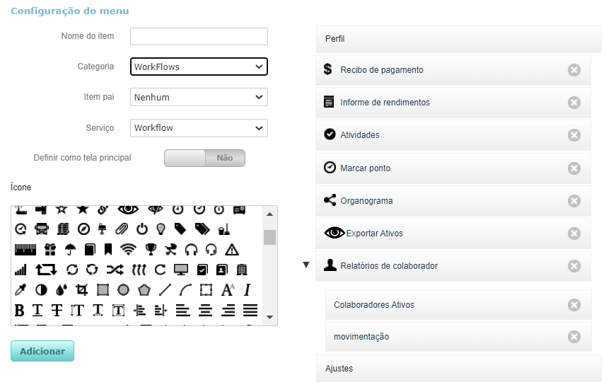 Nesta guia é possível personalizar o Menu do aplicativo, informando os serviços do menu e ícones para cada um deles.