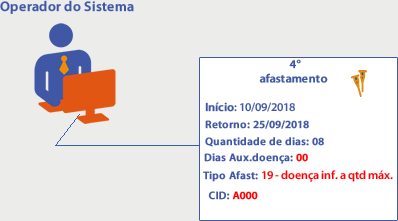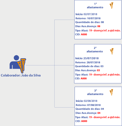 No dia 10/09/2018 foi cadastrada mais uma ocorrência de afastamento para o colaborador João com o mesmo Tipo de Afastamento e CID, com início em: 10/09/2018 e Retorno em: 25/09/2018.