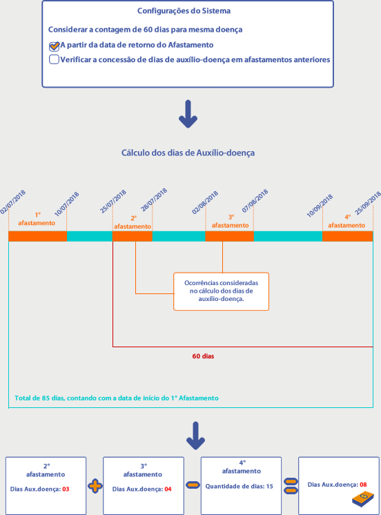 No cálculo dos dias de auxílio-doença, o sistema verificou se em um período e 60 dias havia ocorrências de afastamento com o mesmo Tipo e CID para o colaborador João.
