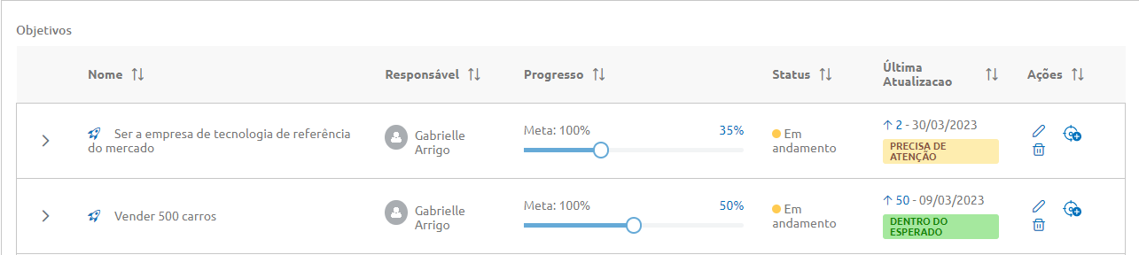 • Status - campo obrigatório que será preenchido com o status atual do objetivo. Por padrão, um novo objetivo vem com o status de Em andamento.
