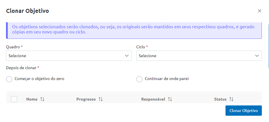 Através do Clonar objetivos ele trará todas as informações do objetivo anterior e o usuário poderá escolher se mantém o andamento do objetivo anterior ou se começará do zero. O usuário também poderá clonar de qualquer quadro que ele tenha visibilidade, trazendo um objetivo de um ciclo anterior ou de um outro quadro qualquer que ele possa visualizar, podendo assim, continuar o objetivo ou servir de base pra criar outro.