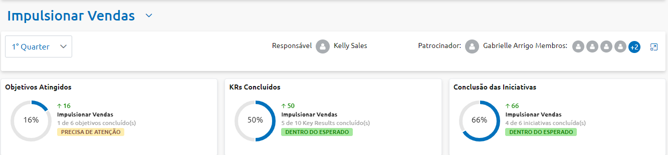 Com o widget KR’s Concluídos será exibido as informações consolidadas a respeito da conclusão dos KR’s, que apresentará as mesmas informações do widget de Objetivos Atingidos porém relacionado ao KR´s, o mesmo se aplicará ao widget de Iniciativas.