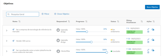 A Pesquisa Geral permite realizar pesquisa na listagem de OKR’s apresentada, e deve considerar todas as colunas e será uma pesquisa simples, em cima dos textos exibidos na tela.