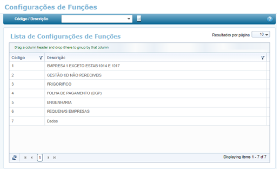 Na Lista de Configurações de Funções, é possível realizar algumas operações, como: ordenações, filtros e agrupamentos.
