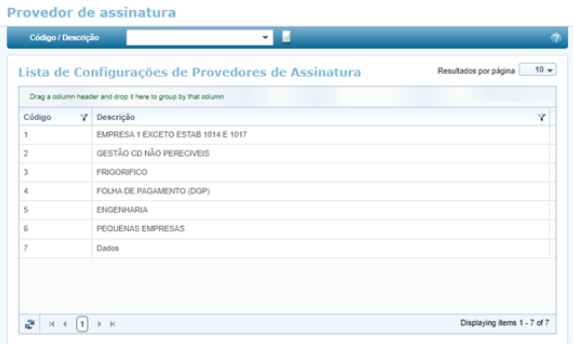 Na Lista de Configurações de Provedores de Assinatura é possível realizar algumas operações, como: ordenações, filtros e agrupamentos. Para saber mais clique aqui.