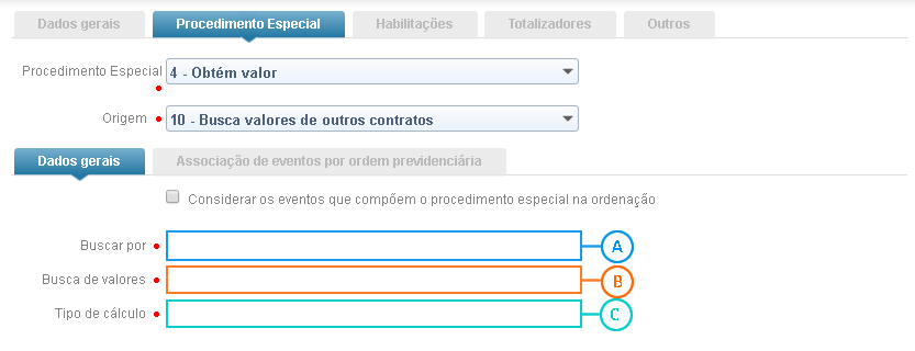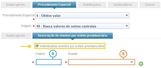 Marque a opção Individualizar os valores encontrados por ordem previdenciária para que o resultado do procedimento especial seja individualizado. Ao selecionar essa opção, os campos Ordem e Evento serão apresentados.