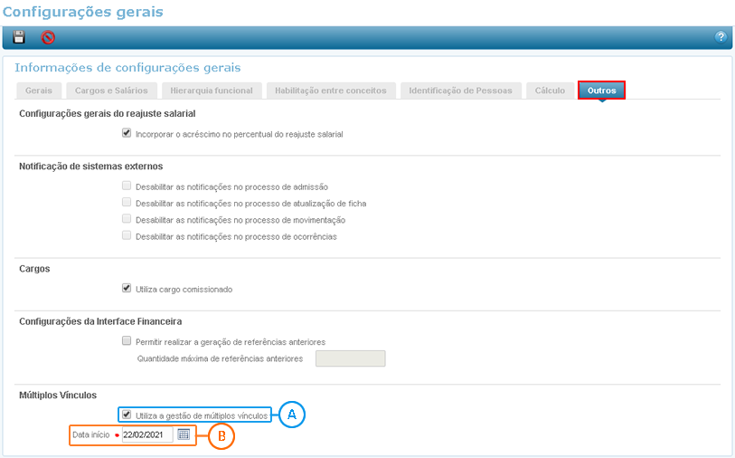 O campo Data início só será habilitado se a opção Utiliza a gestão de múltiplos vínculos estiver marcada. Uma vez habilitada torna-se um campo obrigatório.