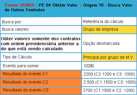 • Criar o evento de PE 04 Origem 10 para buscar o valor do evento de todos os contratos, inclusive de empresas distintas, desde que seja do mesmo grupo de cálculo, conforme imagem abaixo: