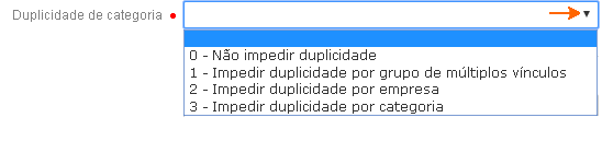 • Uma vez informado para 3 - Impedir duplicidade por categoria e a indicação for por grupo, não será possível adicionar a mesma categoria para impedir por empresa e vice-versa.