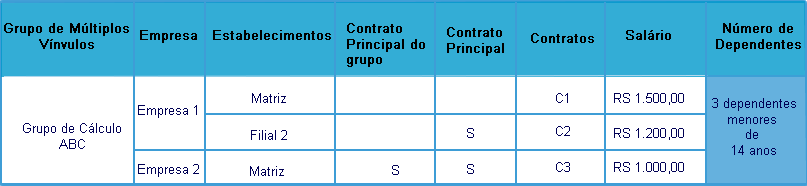 No cadastro de grupo de múltiplos vínculos foi parametrizado para utilizar o conceito de contrato principal por empresa e o colaborador possui 3 contratos, e 3 dependentes menores de 14 anos conforme planilha abaixo: