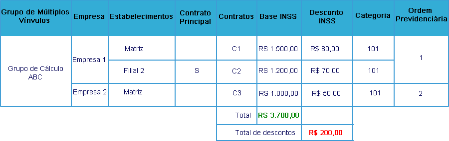 Considere que o colaborador tenha três contratos C1, C2 E C3, sendo 2 contratos na empresa 1 e 1 contrato na empresa 2. Essas empresas pertencem ao mesmo grupo de múltiplos vínculos. Com base nesse cenário o valor de INSS será calculado de forma residual.