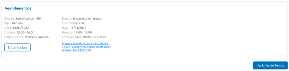 Será possível no painel de acompanhamento conferir uma linha do tempo relacionada à todas as etapas que foram contempladas no processo seletivo.