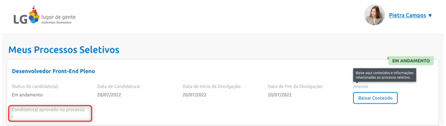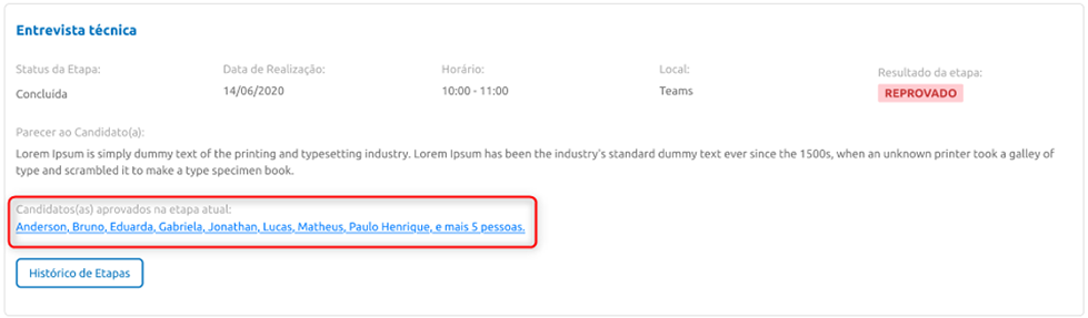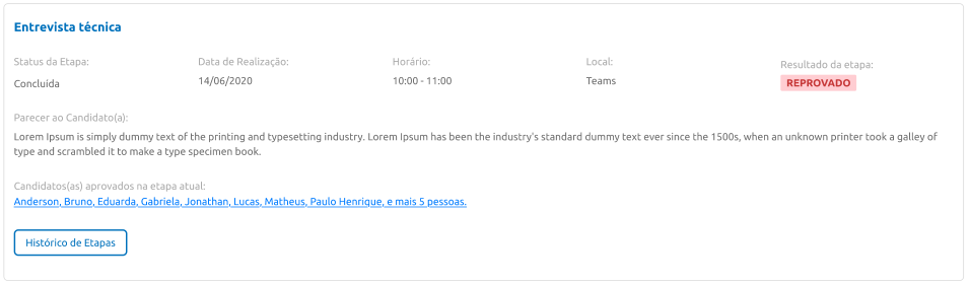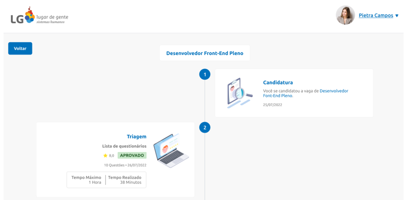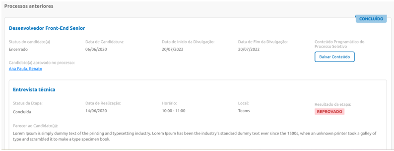 O colaborador poderá consultar o histórico dos demais processos seletivos e etapas ao qual já foi participante.