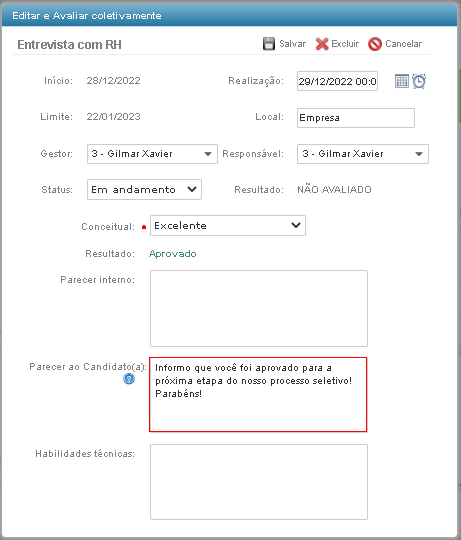 Através do campo Parecer ao Candidato(a) é possível cadastrar um parecer em relação ao desempenho ou ao resultado que o candidato obteve em sua participação na etapa de um processo seletivo em específico, conforme demonstrado na imagem acima.