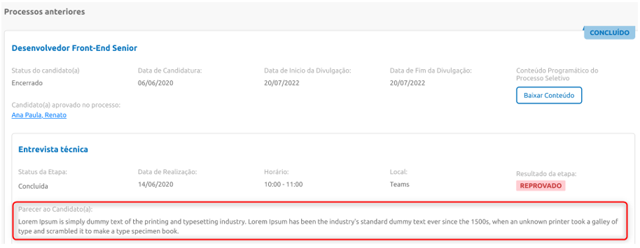 O parecer cadastrado será apresentado ao candidato no Painel de Acompanhamento, nos portais de vaga interno e externo.