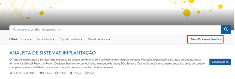 Já para os candidatos internos, o painel deverá ser acessado no Portal interno de vagas, na opção Meus Processos Seletivos.