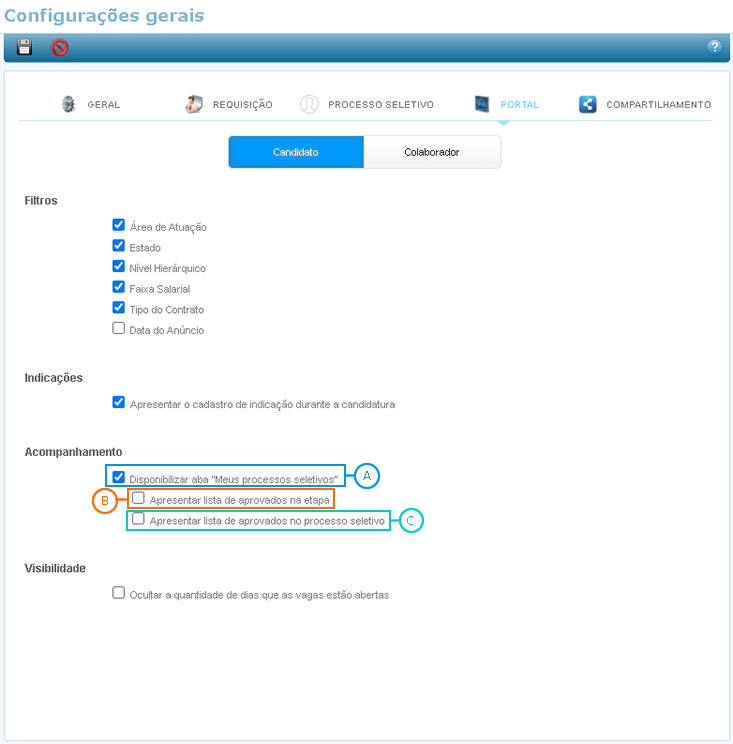 Em defina tanto para Candidato quanto para Colaborador se deseje Disponibilizar aba "Meus processos seletivos". Caso a opção seja marcada, serão apresentadas duas novas opções.
