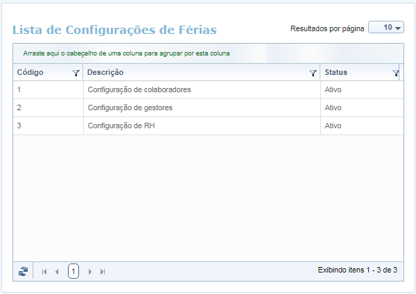 Ao abrir essa funcionalidade é apresentada uma relação das Configurações de Férias já cadastradas: