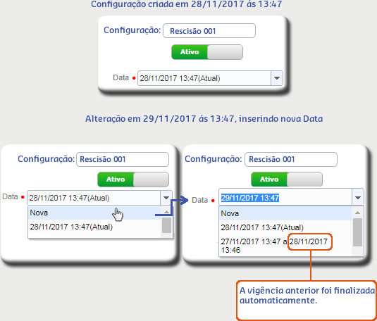 Ao alterar algum dado da configuração e informar uma nova Data, inicia-se uma nova vigência encerrando a anterior.