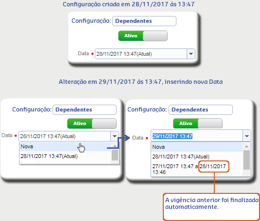 Ao alterar algum dado da configuração e informar uma nova Data, inicia-se uma nova vigência encerrando a anterior.